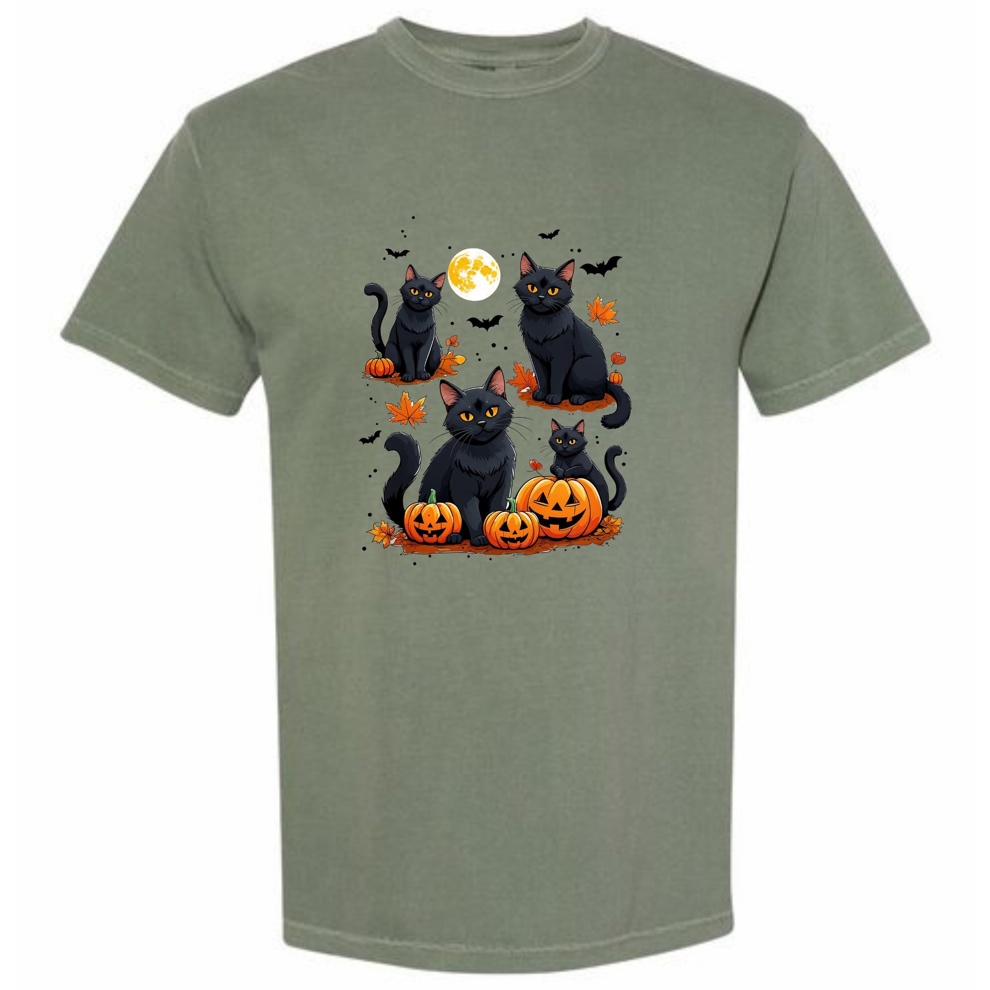 - Features playful black cats under a full moon with pumpkins and bats for authentic spooky season fashion