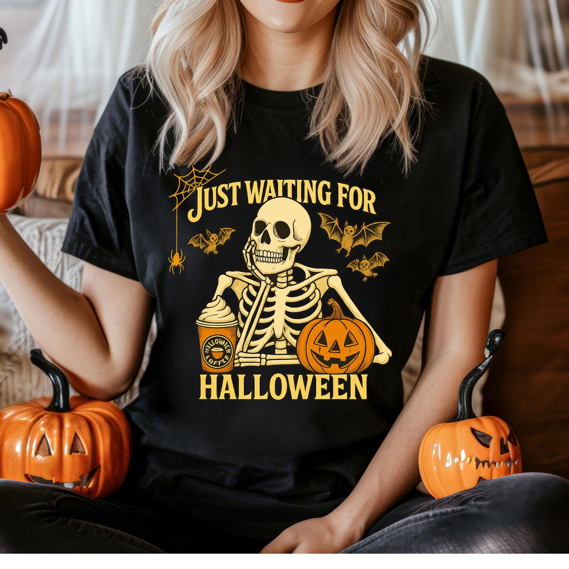 - "Just waiting for halloween" slogan adds playful charm and seasonal spirit