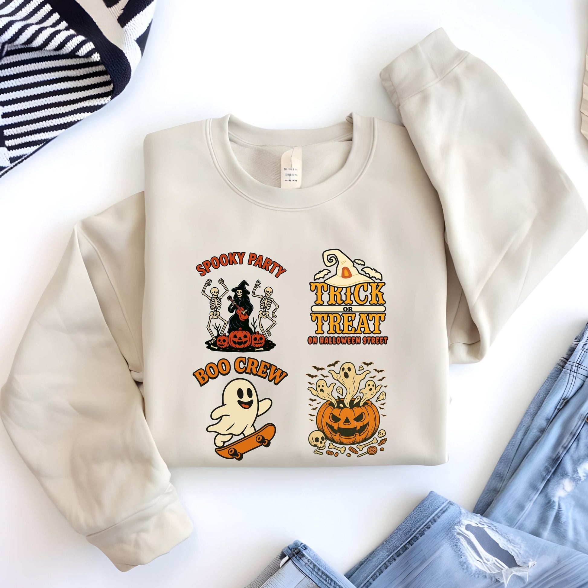 • Four retro Halloween sweatshirt graphics: Boo Crew Ghost Skateboard, Spooky Party Skeletons, Trick or Treat Hoodie, Haunted Pumpkin Shirt