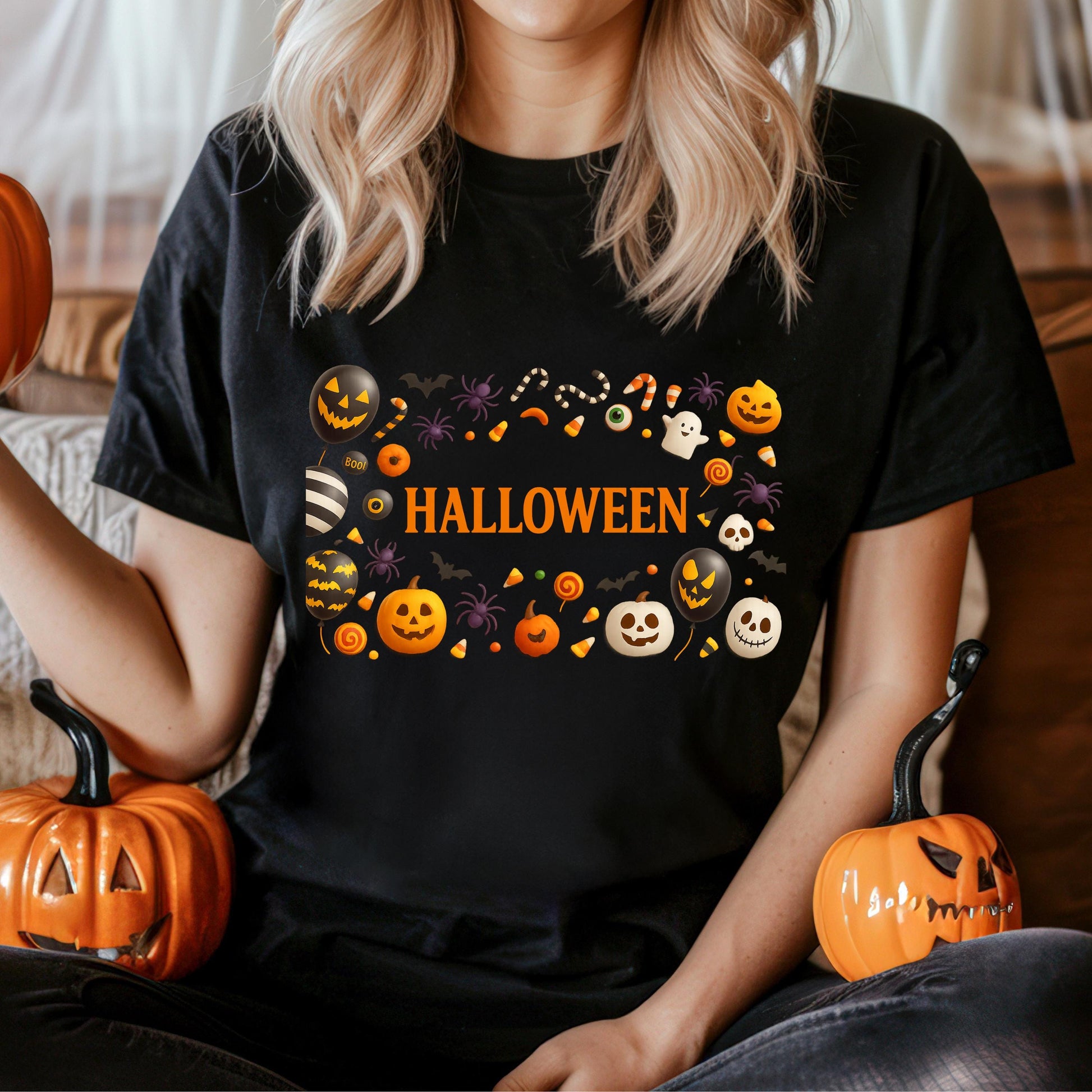 Crafted as a unisex Halloween shirt, this soft cotton fabric top fits men and women comfortably, available in sizes S to XXL. The festive Halloween apparel combines a vintage Halloween tee look with modern quality, making it ideal fall season clothing for those who want to showcase their love of Halloween. The pumpkin orange base is adorned with black graphics of pumpkins, ghosts, bats, candy, and spiders, creating a spooky spirit shirt that stands out at any haunted costume shirt event or casual outing.