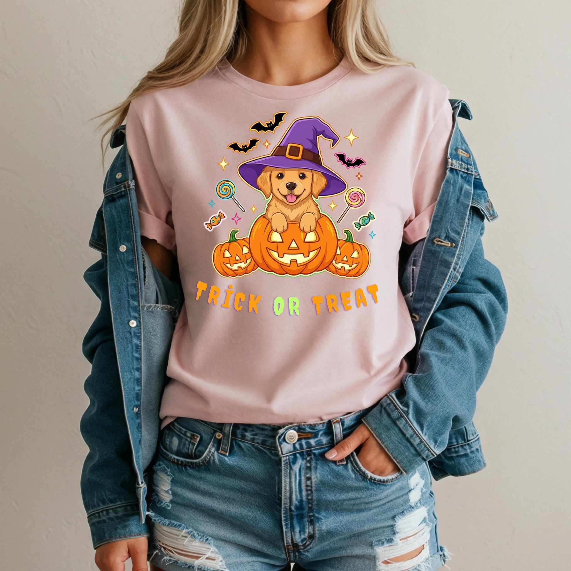 Halloween Puppy T-Shirt – Cute Golden Retriever Tee With Pumpkin, Witch Hat & Candy