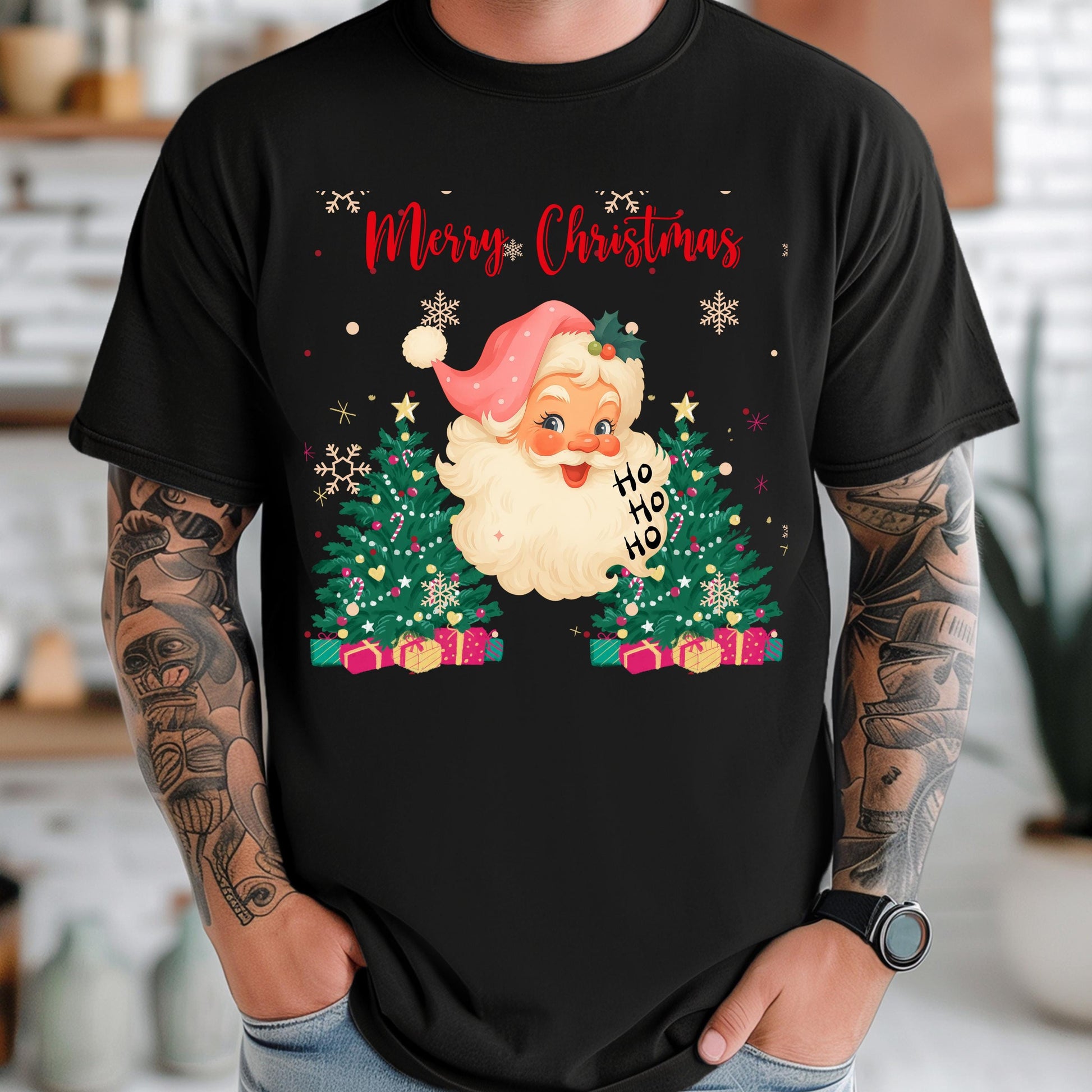 • Retro Santa tee design with pink hat and Christmas tree graphics