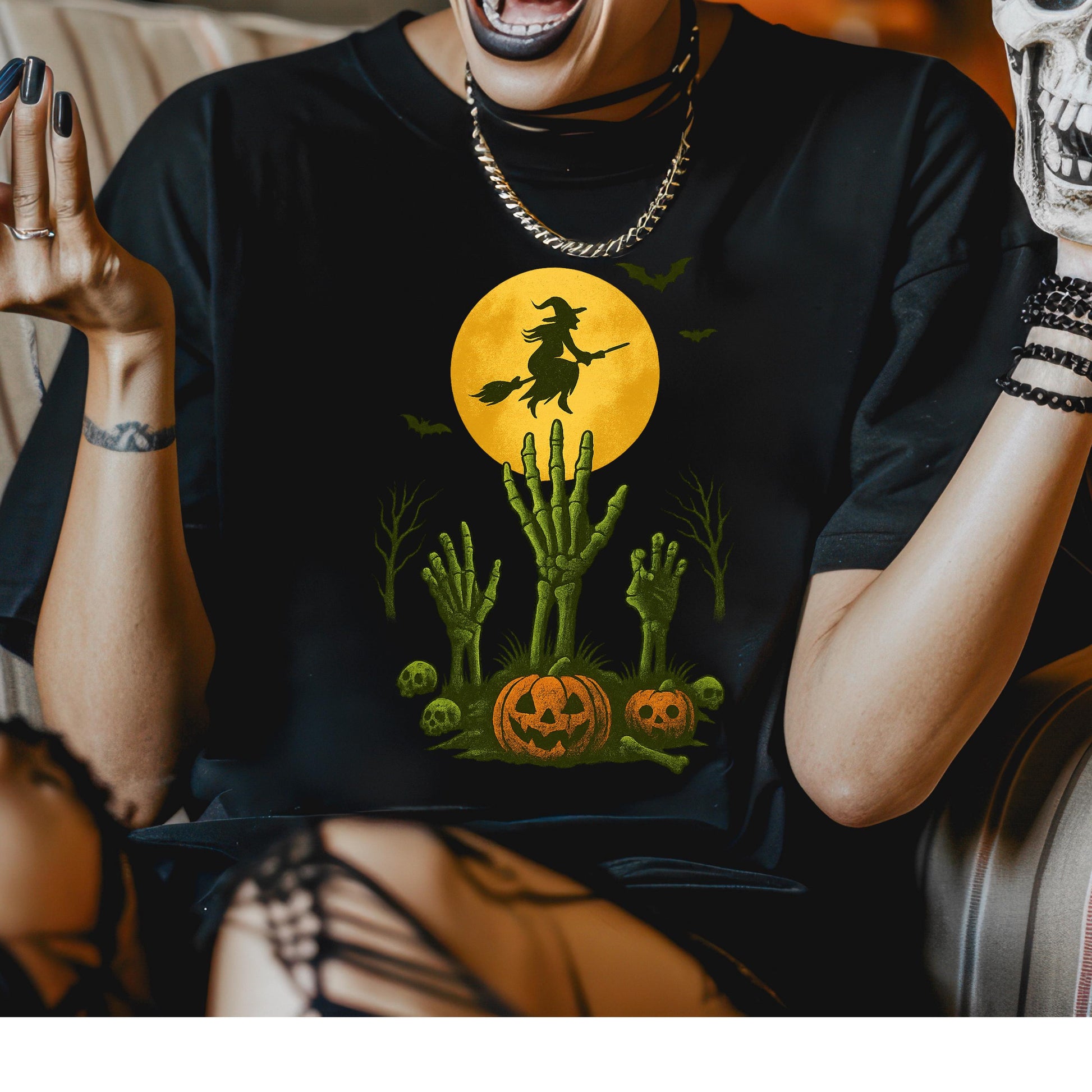 • Machine washable → easy care maintains the creepy witch tee look wash after wash
