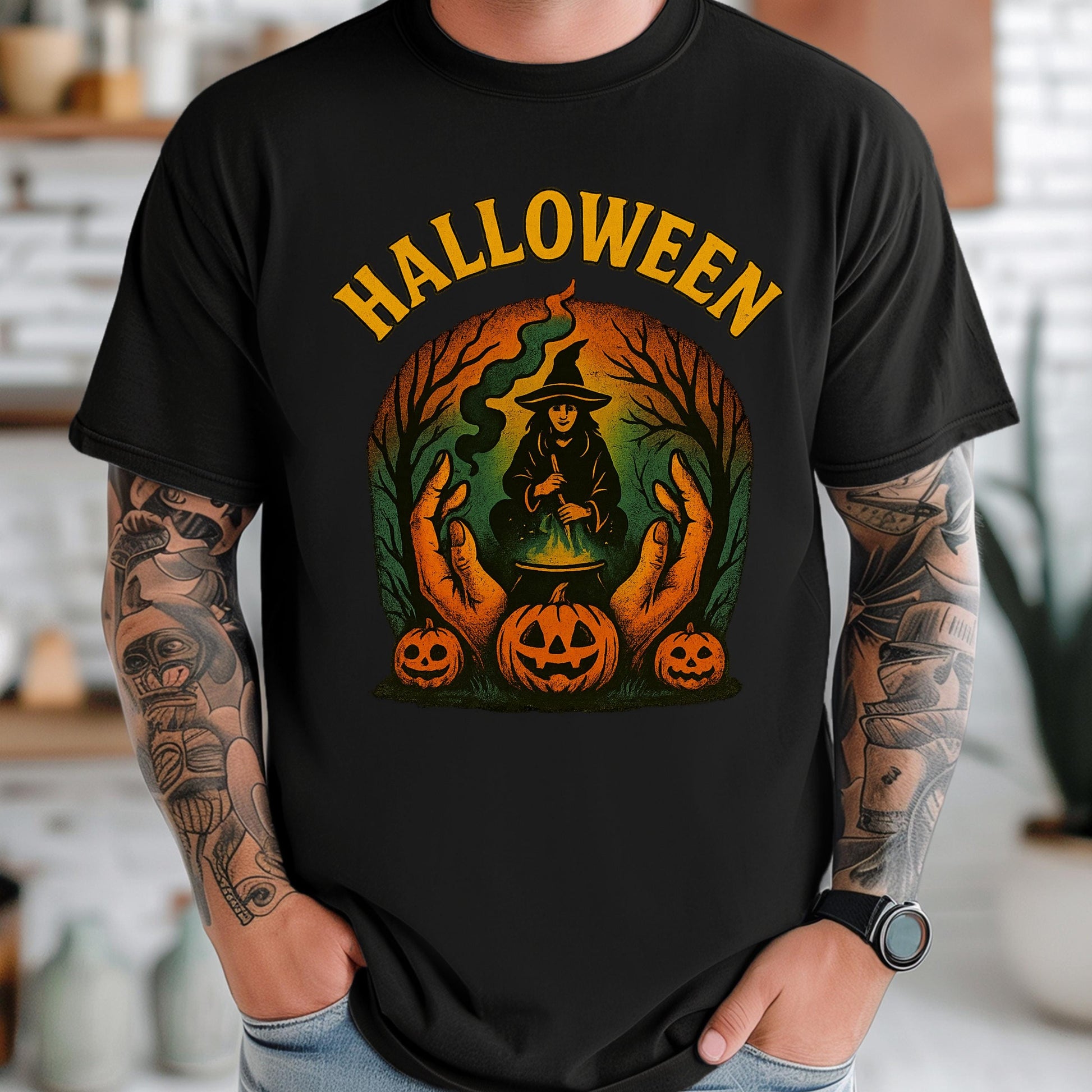 This unisex halloween top fits true to size from S to XL, featuring a classic crew neck t-shirt cut and short sleeves that make it ideal for layering or wearing alone. The graphic halloween apparel showcases a vintage halloween shirt vibe with a witchy halloween design surrounded by pumpkins and eerie forest details, making it an excellent pumpkin carving shirt for October festivities.